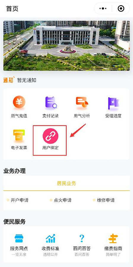 ? 全部綁定完成后,點擊首頁的“用戶綁定”可查看并切換當前登錄的燃氣賬戶。