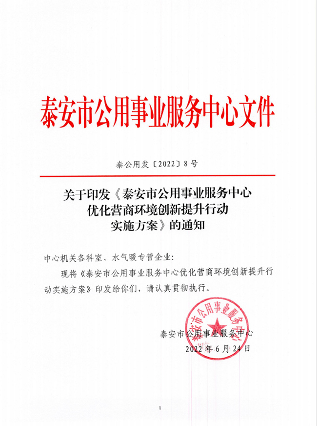 關(guān)于印發(fā)《泰安市公用事業(yè)服務(wù)中心優(yōu)化營商環(huán)境創(chuàng)新提升行動實施方案》的通知